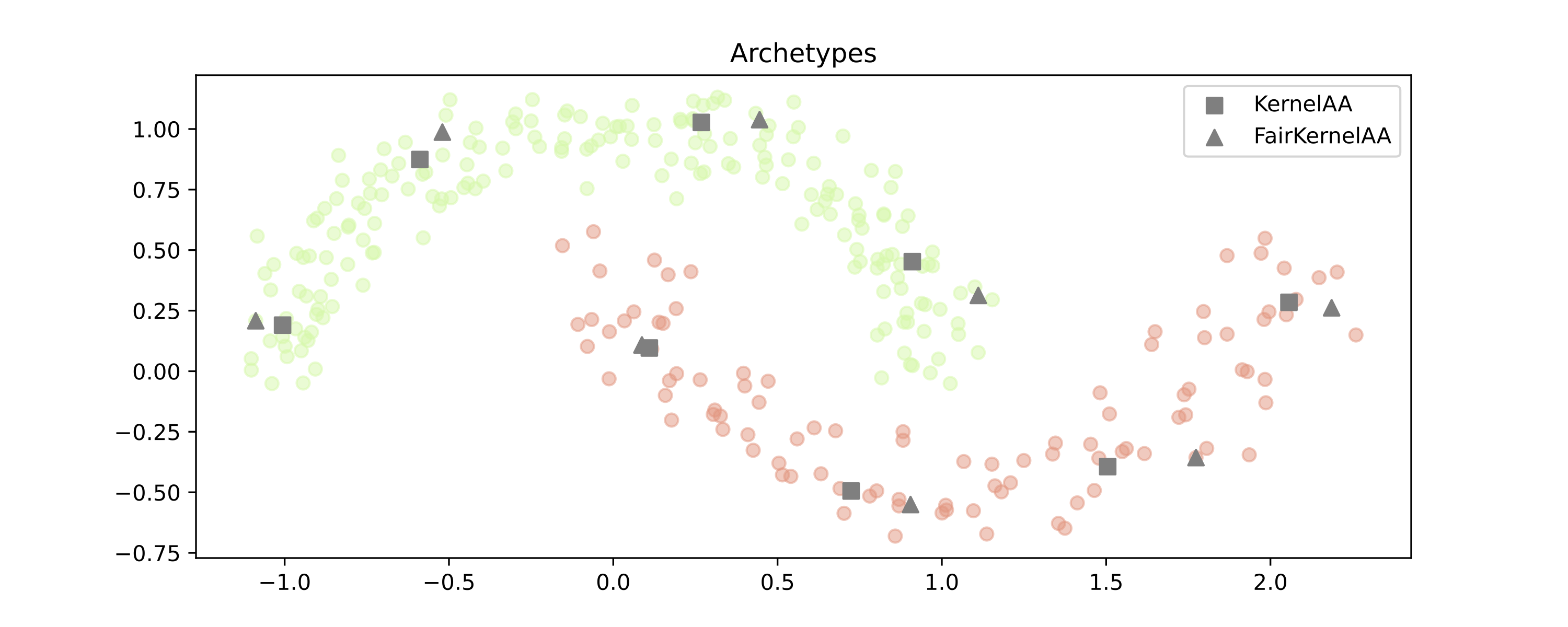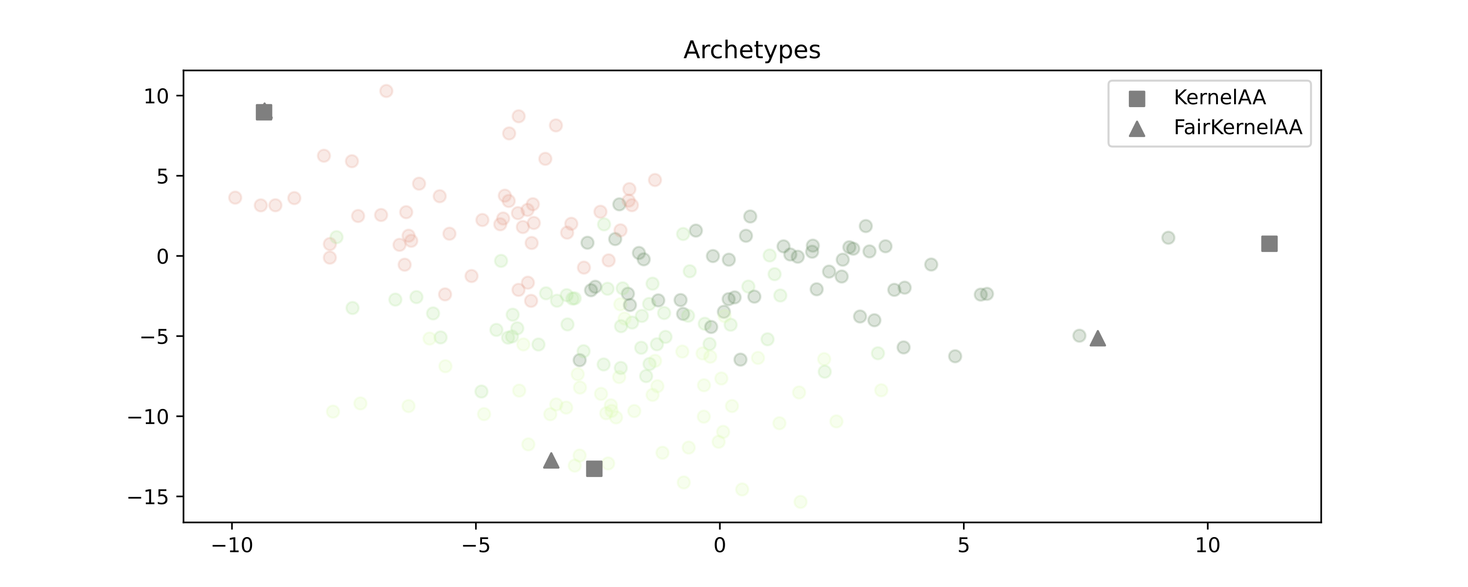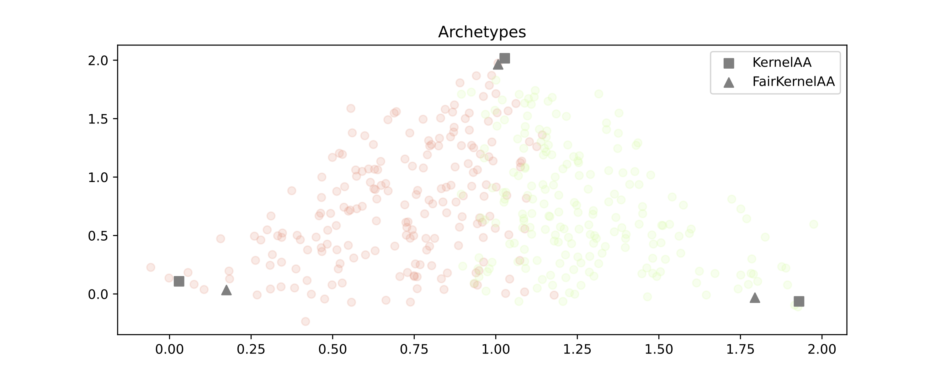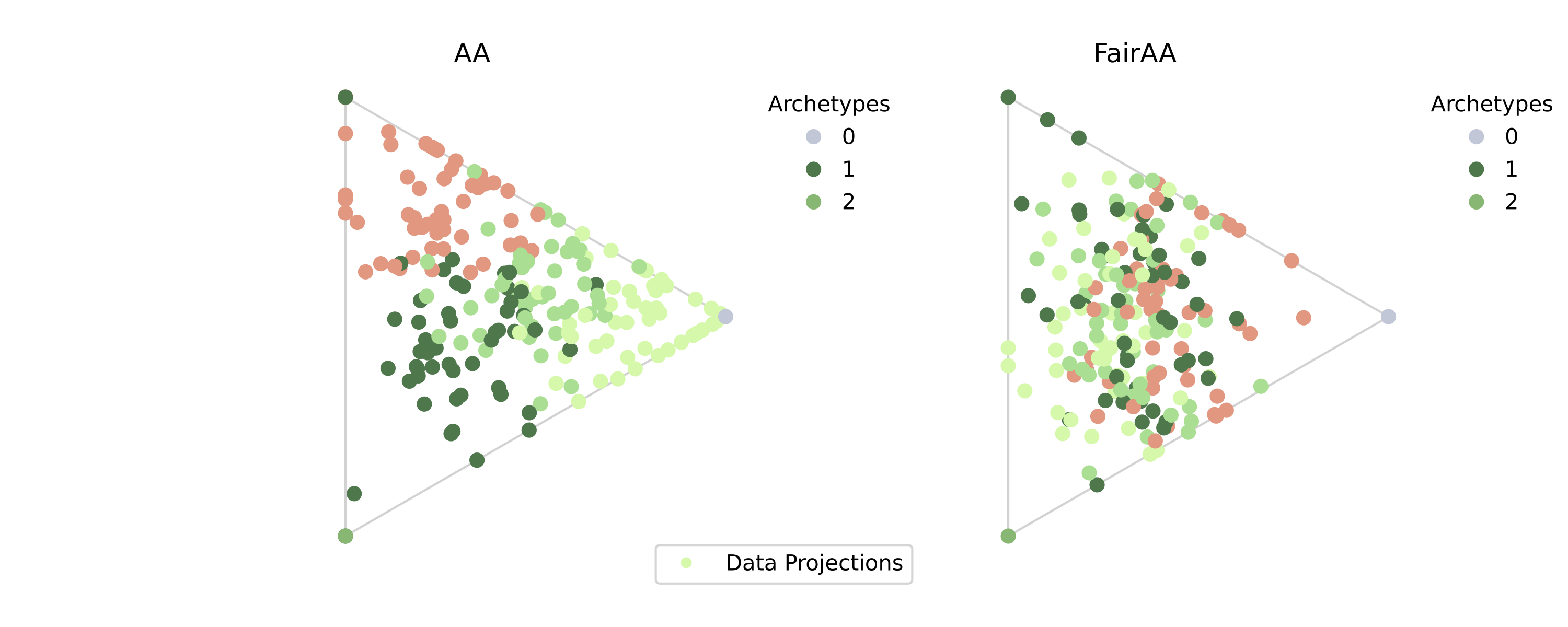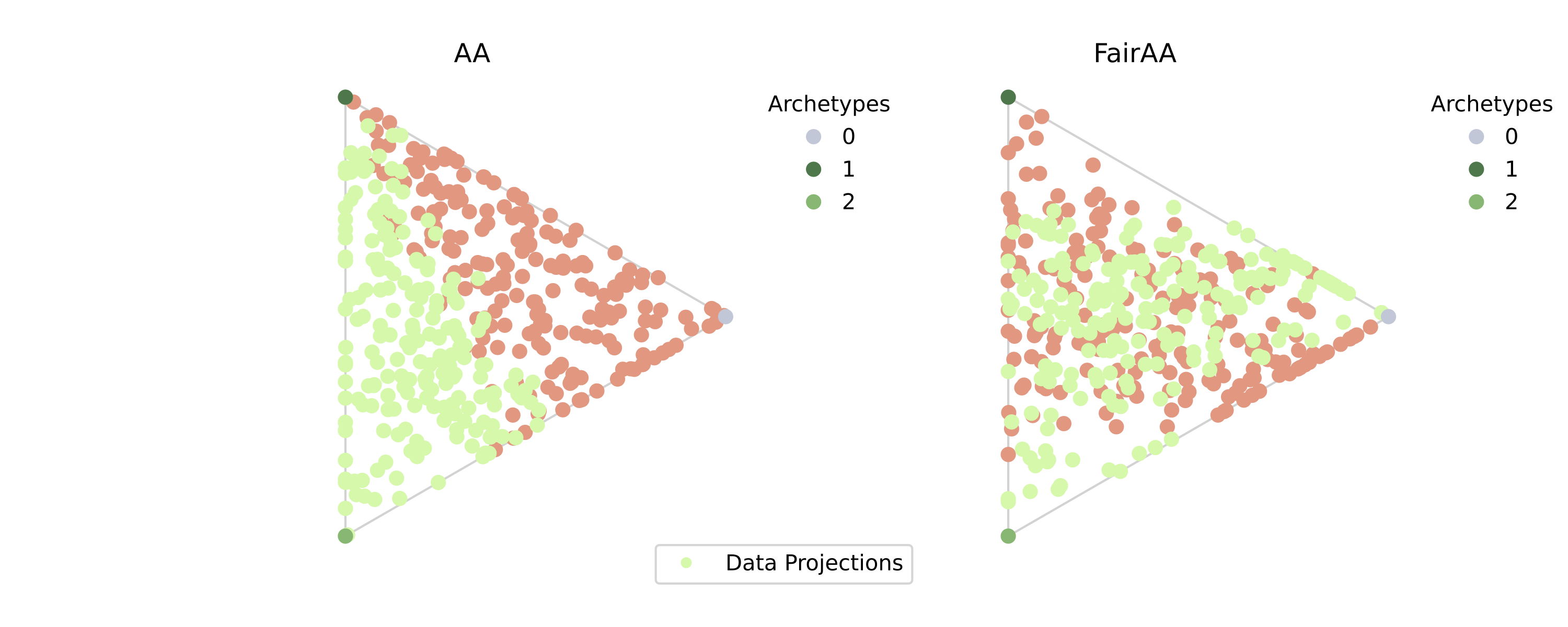 Following the work of Kleindessner et al. in 2023 on fair PCA, our objective in fair archetypal analysis (FairAA) is to obscure critical information when projecting the dataset onto the archetypal space.